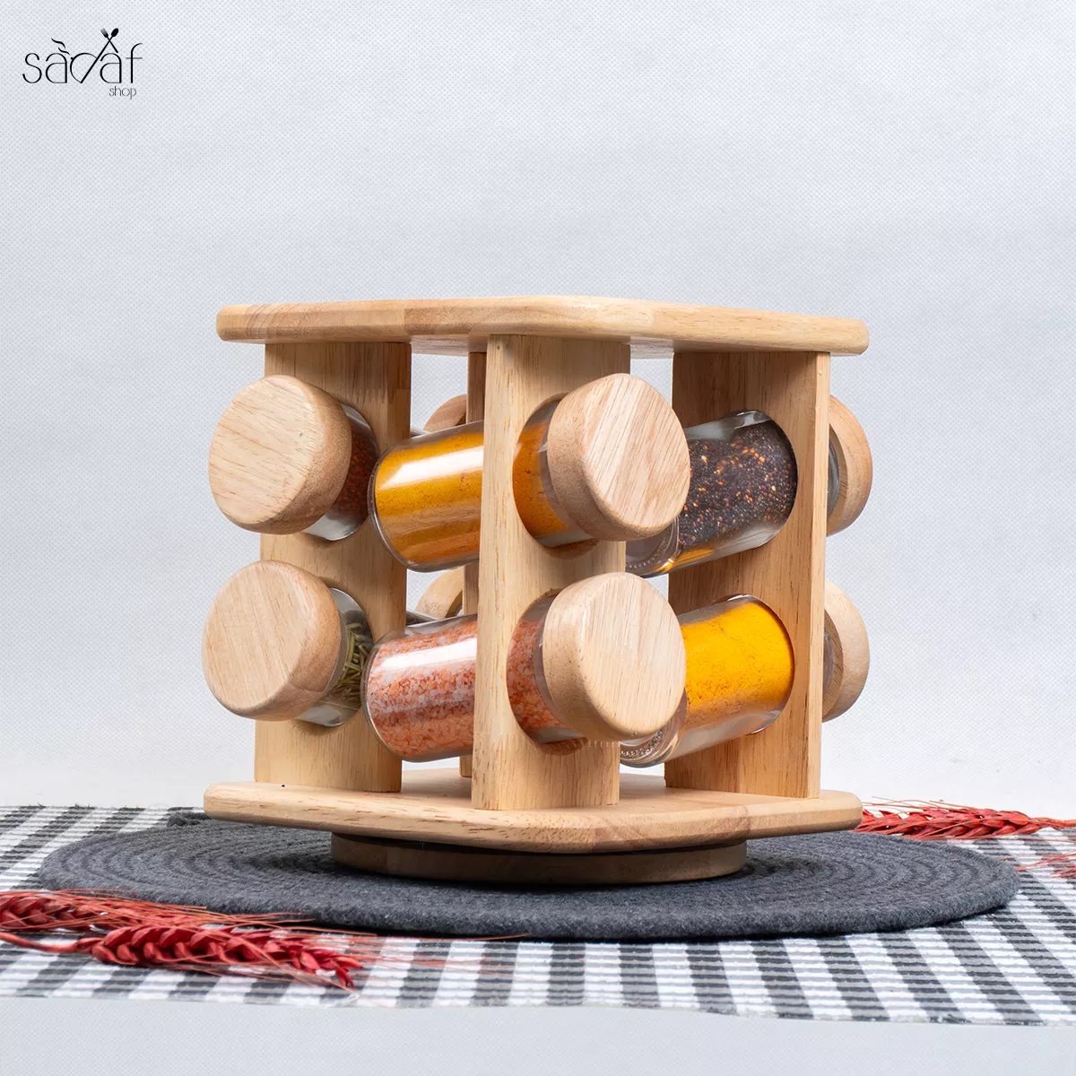 شامل ۸ عدد ظرف ادویه درب چوبی با بدنه شیشه ای بلور ایرانی است. پایه این سرویس از جنس چوب است و از مقطع دایره ای خود می چرخد، به همین علت دسترسی به ادویه ها آسان شده است.