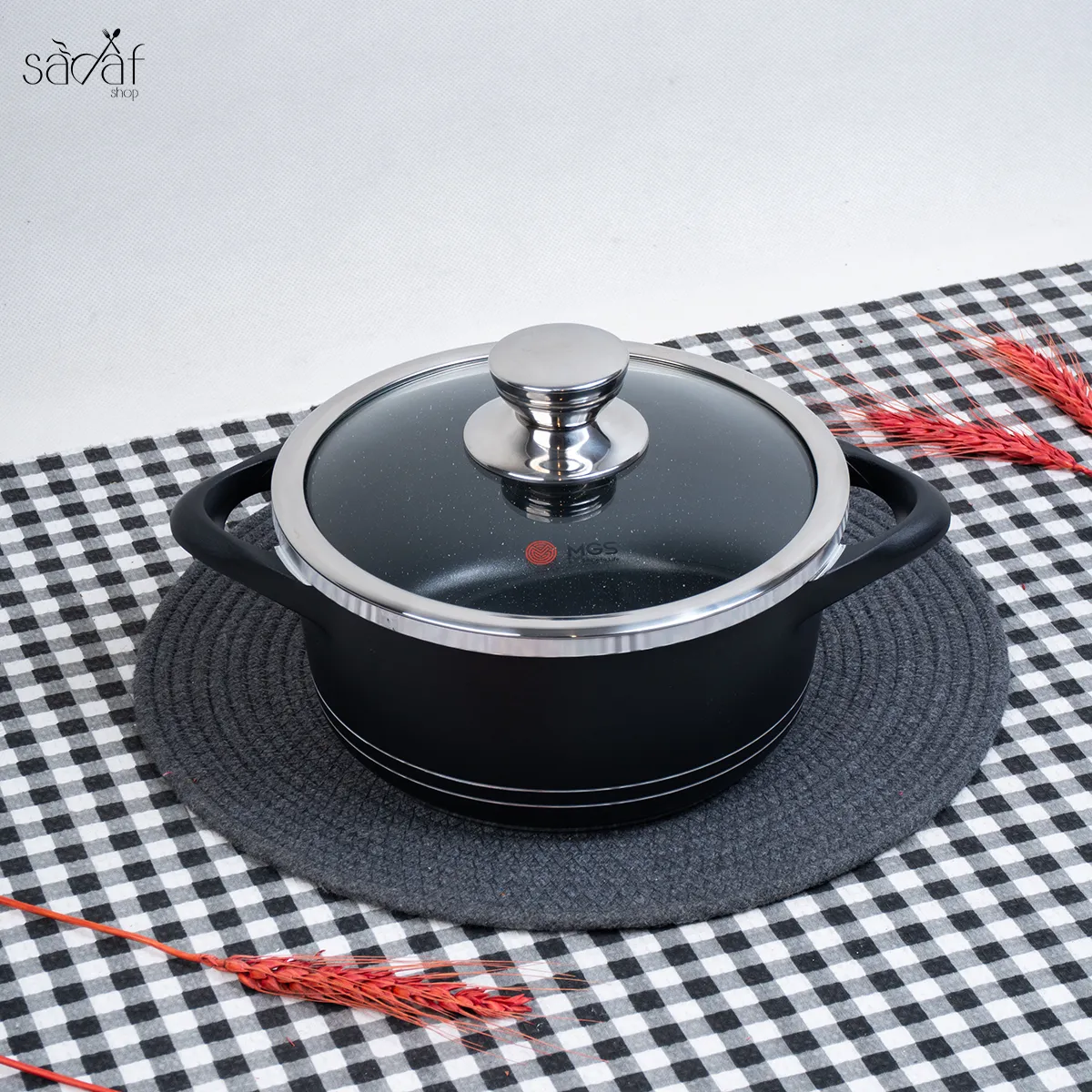 قابلمه MGS از آلومینیوم جنس داخل روکش گرانیت ساخته شده است که چسبندگی مواد غذایی را در این محصول به صفر می رساند و پخت و پز با کمترین میزان روغن امکان پذیر می باشد.علاوه بر این ، گرانیت استفاده شده در این محصول ضد خش بوده و در برابر سایش قاشق های آهنی مقاوم است.