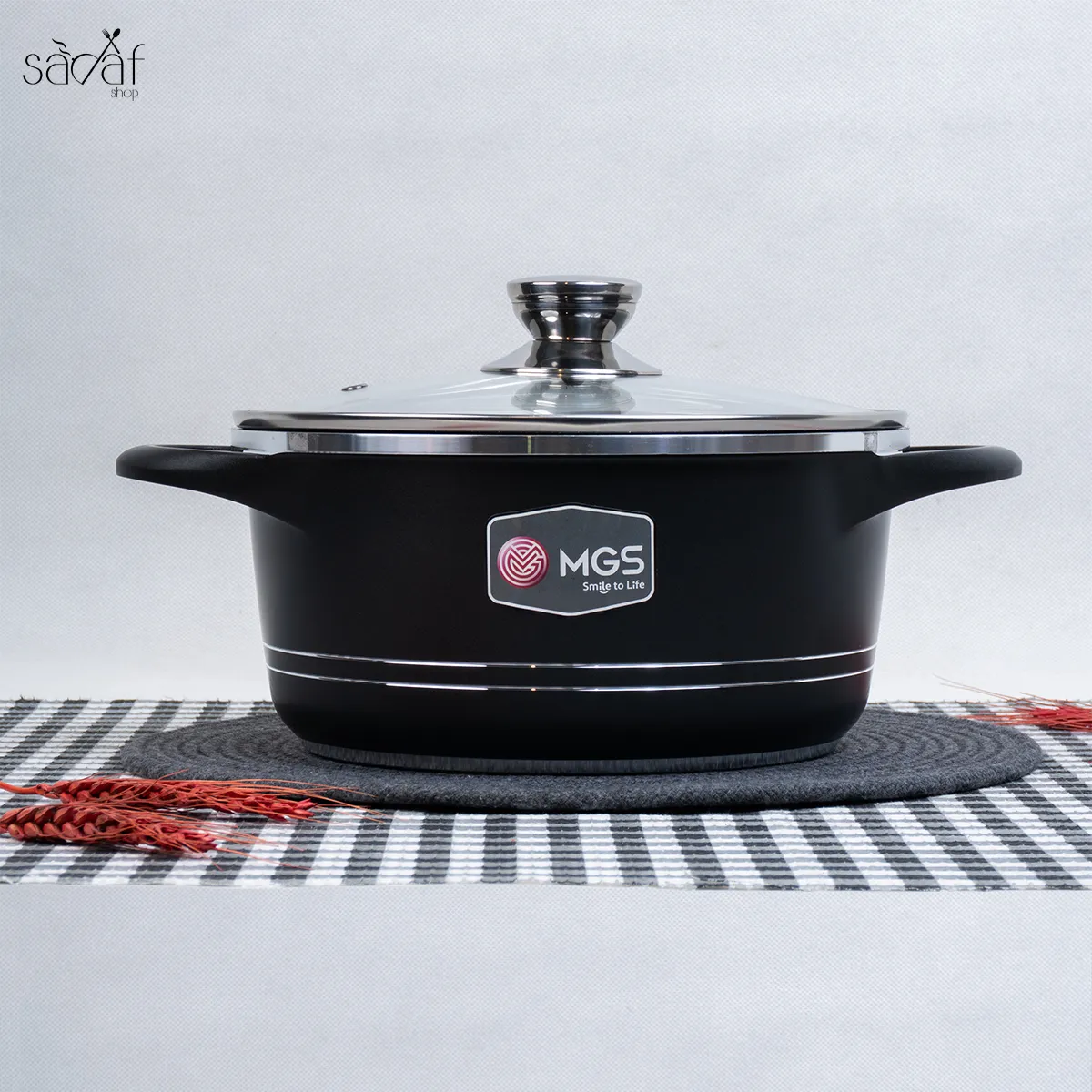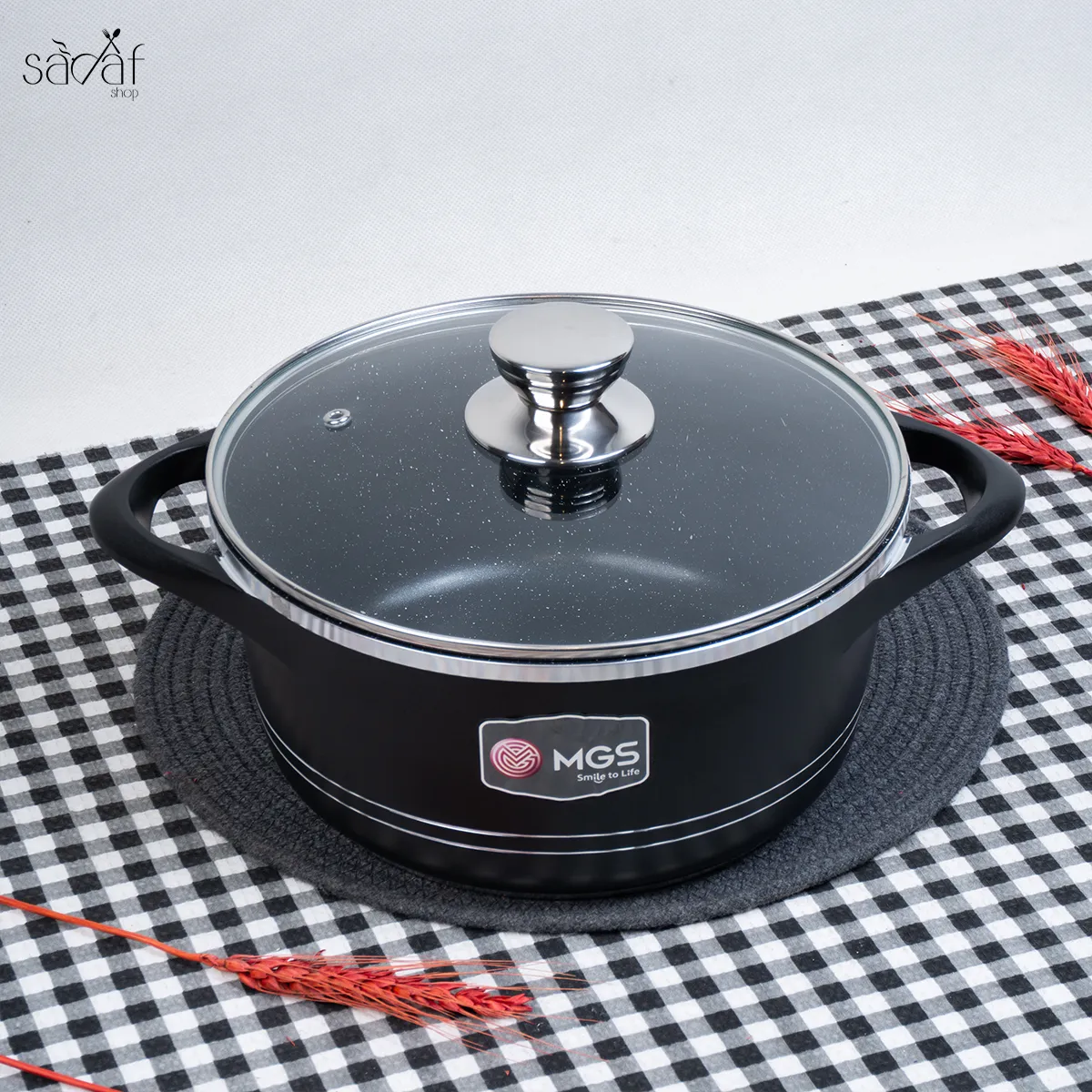 قابلمه MGS از آلومینیوم جنس داخل روکش گرانیت ساخته شده است که چسبندگی مواد غذایی را در این محصول به صفر می رساند و پخت و پز با کمترین میزان روغن امکان پذیر می باشد.علاوه بر این ، گرانیت استفاده شده در این محصول ضد خش بوده و در برابر سایش قاشق های آهنی مقاوم است.