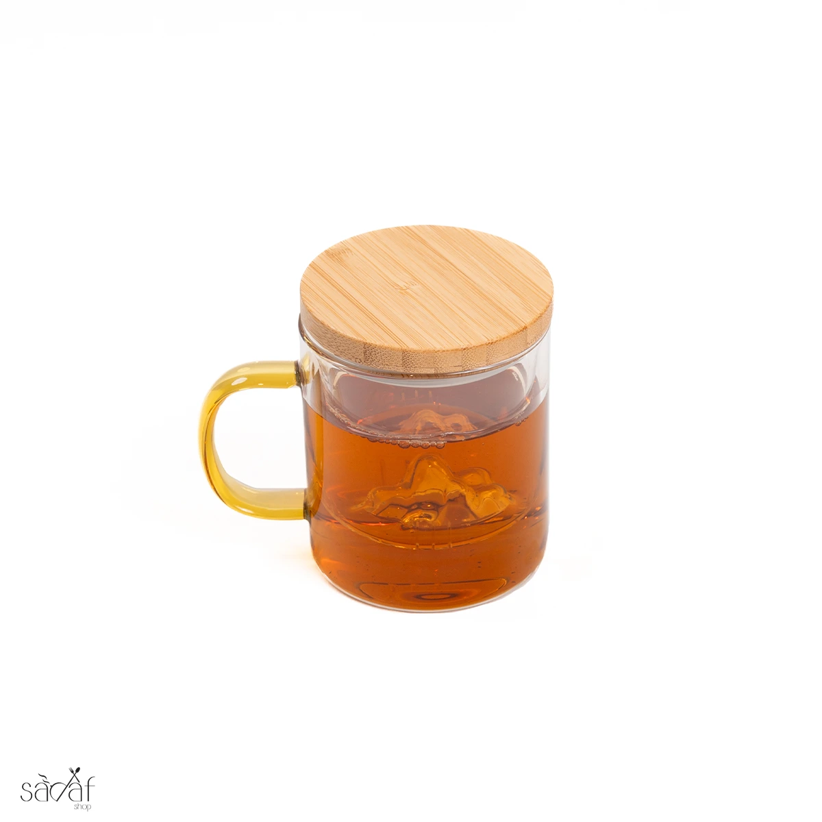 لیوان دمنوش پیرکس دو جداره در بامبو دسته رنگی ۳۰۰ سی سی (یک عددی)